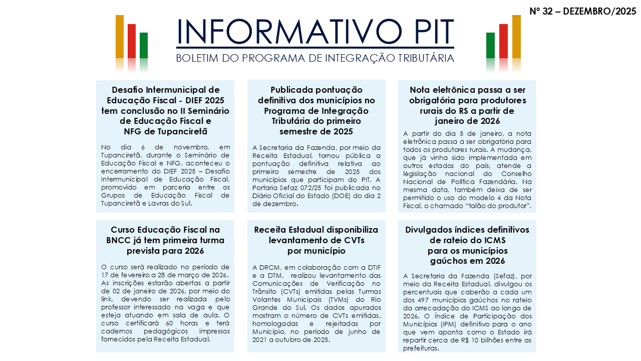 A divulgação deste boletim pontua na Ação 1.03 - Divulgação do Programa de Educação Fiscal, do Grupo I – Educação Fiscal do PIT.